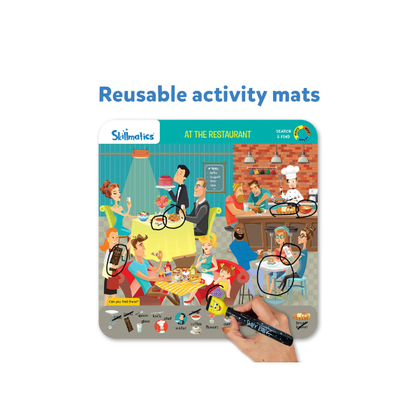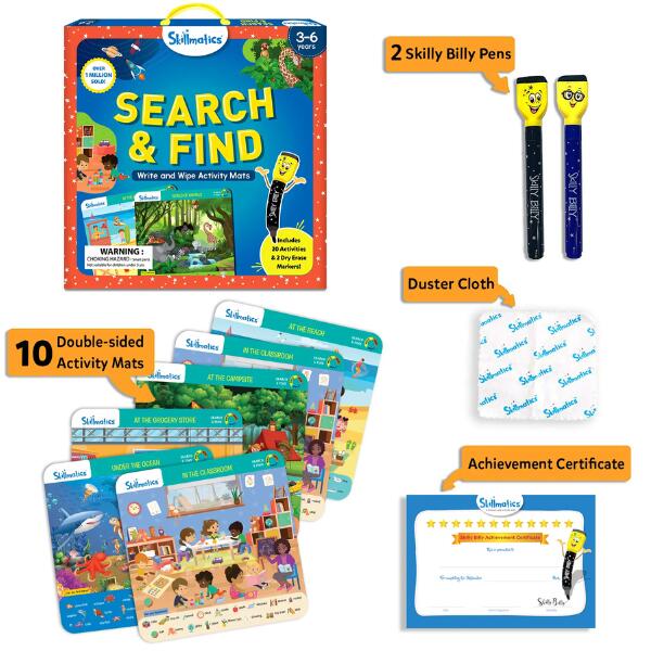 • Search & Find Write And Wipe Activity Book: Search & Find includes 20 repeatable activities designed to expand vocabulary, sharpen observation skills, and develop logical reasoning, all in an interactive and fun way! It includes 10 Double-sided Activity Mats, 2 Skilly Billy Dry-Erase Pens, 1 Duster Cloth, and an Achievement Certificate.  Kids learn best through repetition! Our mats are easy to clean, allowing endless practice to reinforce and perfect their skills.