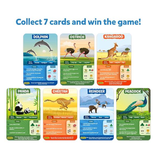 Bring home the most exciting game of questions! Ask up to 10 questions to guess the animal on the Game Card! Is it a carnivore? Is it a domestic animal? Does it live in groups? Think hard, ask intelligent questions, use your clue cards wisely, and be the first player to win 7 Game Cards! Helps kids learn interesting animal facts while developing their logical thinking and strategy skills.