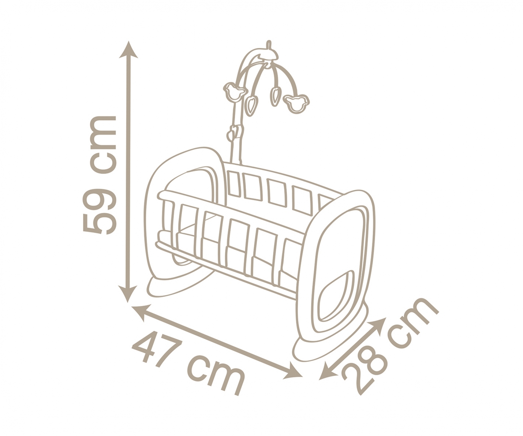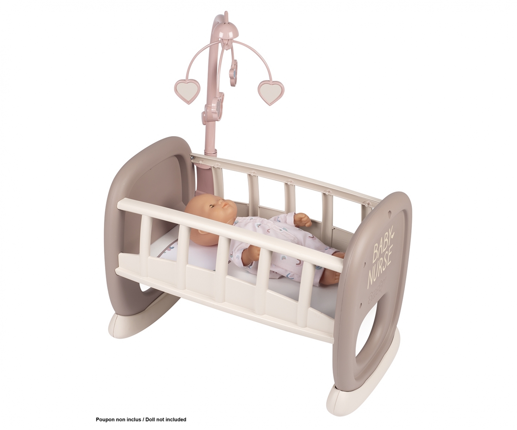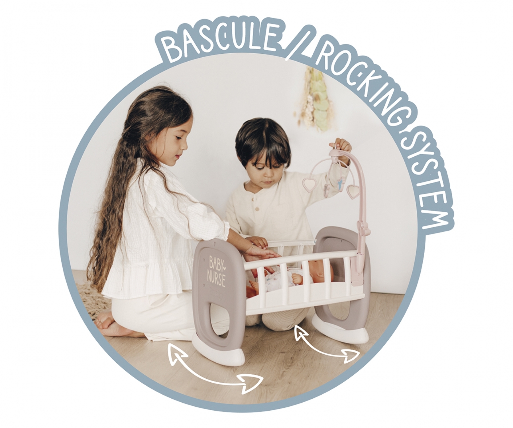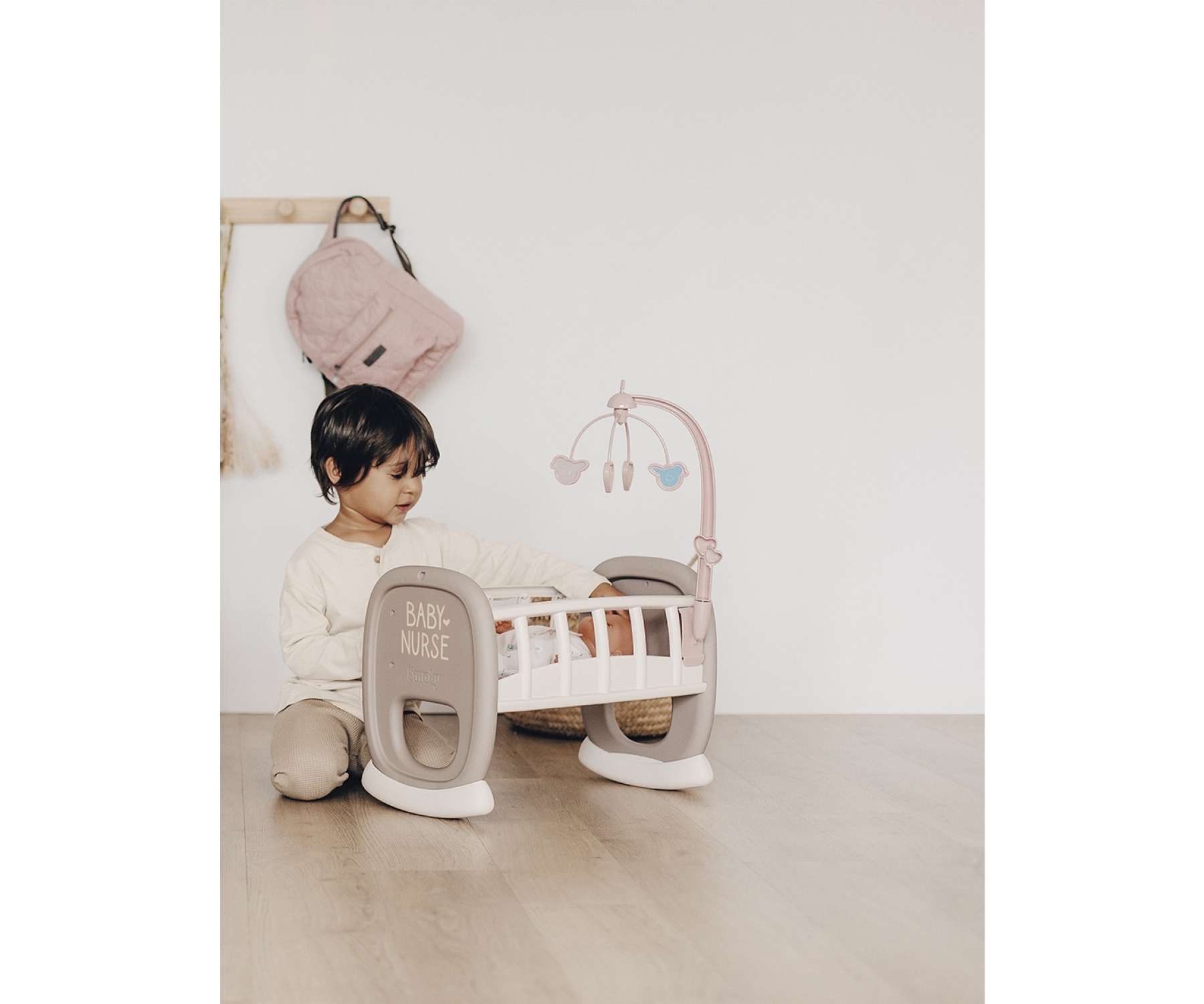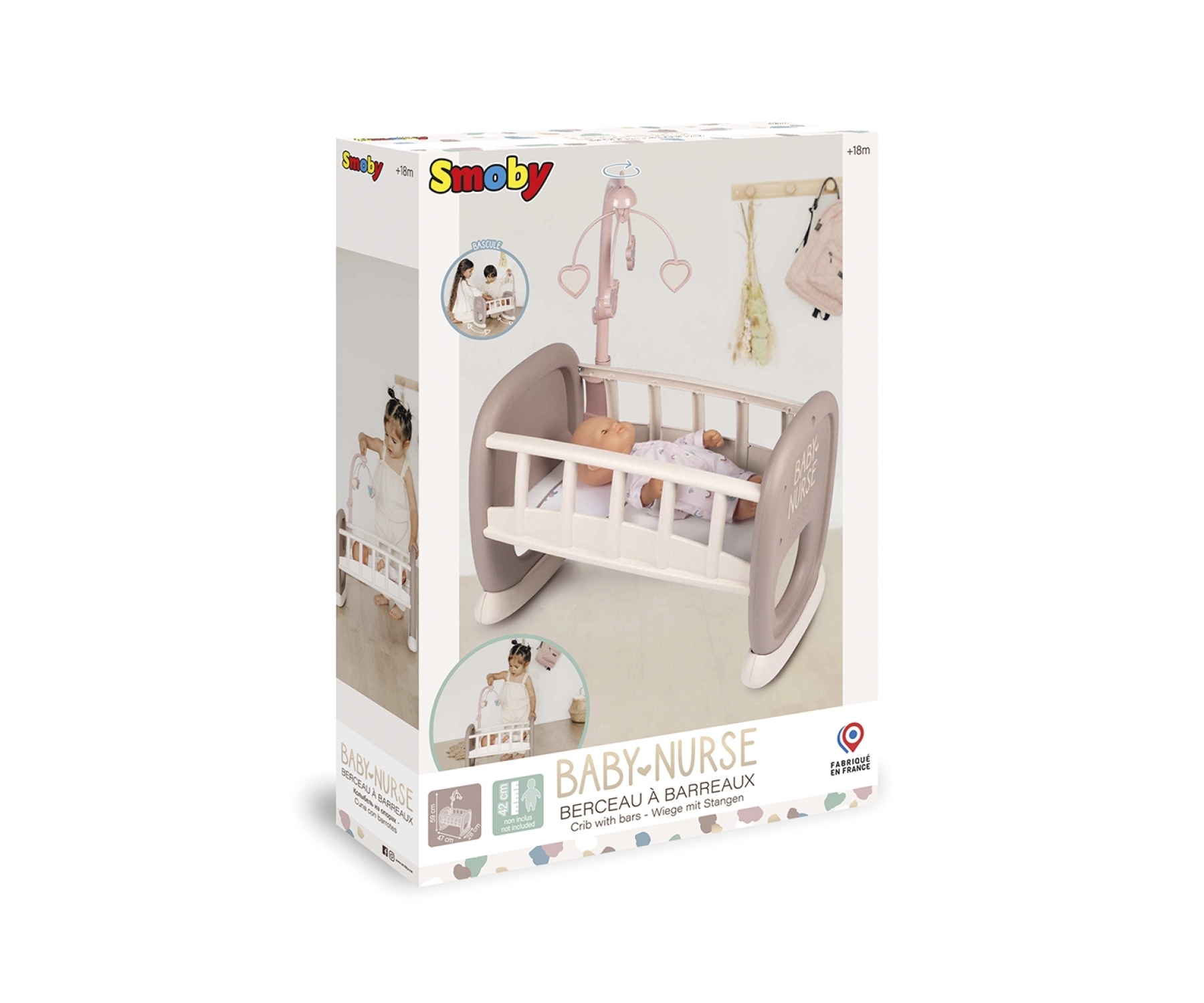 Introducing the Smoby Baby Cot. With the Baby Nurse rocking bed, your child will imitate your actions during the bedtime! Thanks to the rocking bed system and the mobile to turn manually, your toddler will not have problem to cradle his baby doll and to get it to sleep! The rocking bed will become quickly an essential element! For dolls up to 42cm. Doll not included. Suitable for children from 18 months and up – Made in Franc