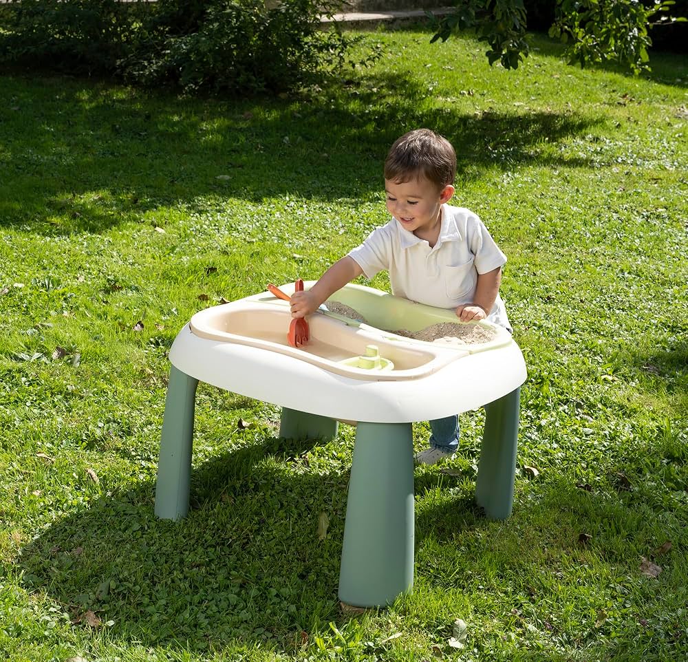 Smoby Life Sand & Water Playtable. The outside games table is ideal for little spaces! Your children will be able to play simultaneously with water and sand thanks to 2 removable trays. They will leave room for imagination with the included accessories: 1 shovel, 1 rake, 1 boat, and 2 sand moulds. You will be able to adapt a sun umbrella (not supplied) to protect your children against the sun.