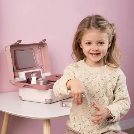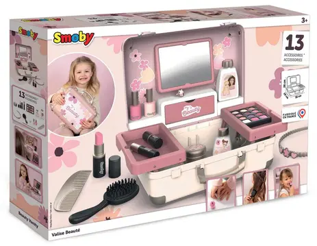 With My Beauty Vanity your child has everything at his disposal to take care of their riends! It is easy to transport and has 2 latches and 1 handle. 3 universes are gathered in this case: hairdressing, nail salon, make-up. The 13 fake accessories included are perfect replicas and promise hours of play: 2 nail polishes, 2 lipsticks, 1 eyeshadow palette, 1 mascara, 1 brush, 1 comb, 1 headband, 1 ring, and different flasks. 1 real mirror and 1 secret hatch are included. The retractable shelves enable a space saving and additional storage spaces. For children aged 3 years and over – Made in France.