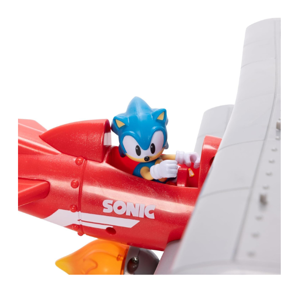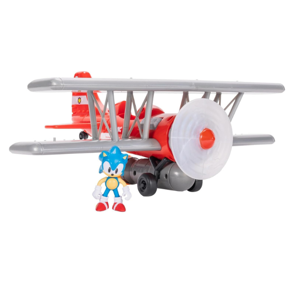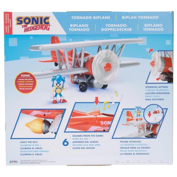 Introducing the Sonic The Hedgehog Tornado Biplane Playset, Fly into the exciting world of Sonic with our Tornado Biplane playset! Activate classic Sonic music from the video game with the press of a button. Experience dynamic motion with a motorized spinning propeller and a light-up flame, each with accompanying sound effects. There are even flight sounds as the plane sways to the left and right, and free-moving wheels to add to the authenticity. There are 6 sound effects that can be incorporated into the play! The Tornado Biplane includes a 2.5-inch Sonic figure and the wings have pegs to attach additional figures for endless creative playtime possibilities.