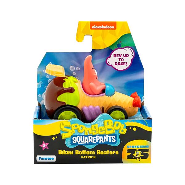 Introducing the all-new Bikini Bottom Boaters – your ticket to revved-up racing fun with SpongeBob and friends! To immerse yourself in nautical nonsense, simply hold the vehicle, rev in a forward motion, and release to watch Patrick zoom into action! Classically designed with the beloved character Patrick in his ice-cream cone themed vehicle. Collect them both for endless revved-up fun! Appropriate for ages 3 and up. Hold the vehicle, rev in a forward motion, and release to watch Patrick zoom into action.