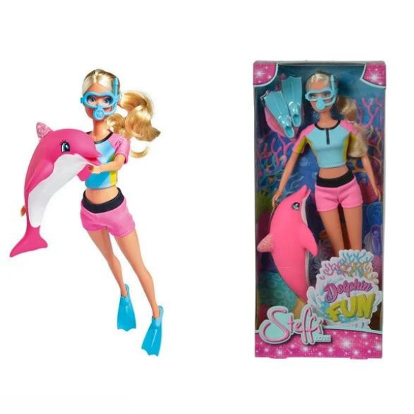 Steffi Love Dolphin Fun in the underwater world. A stylish wetsuit as well as equipped with goggles and fins, exploring the seas. This means that it is accompanied by a cute pink dolphin. Steffi explores the underwater world in a two-piece short diving outfit with blue fins and goggles. Their SL Dolphin Fun is 29 cm in size and suitable for children aged three years and above. Please note the doll cannot stand alone.
