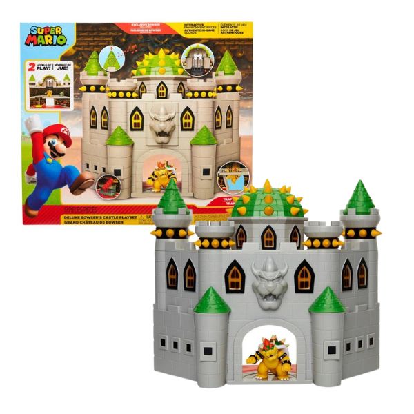 Super Mario Bowser Castle Playset. The Deluxe Bowser’s Castle Playset let’s you explore this classic level from the Super Mario video games. Included in this playset are an exclusive two and a half inch Bowser figure, interactive environment pieces with feature mechanisms, and authentic in-game sounds. Explore Bowser’s castle with all its feature mechanisms and sounds. Interact with the lift by moving it up and down. Spin the fireballs back and forth for authentic gameplay action. Drop Bowser into the lava by triggering the trap door.