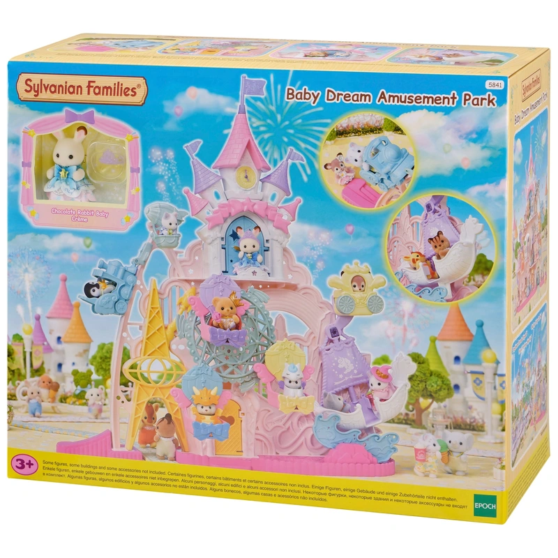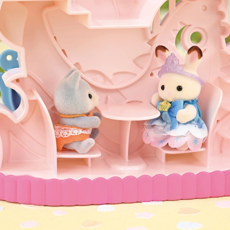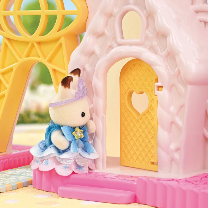 Sylvanian Families Baby Dream Amusement Park Set comes complete with a castle featuring a clock and a variety of exciting attractions. The Chocolate Rabbit baby is dressed in a princess dress. Each attraction can be enjoyed by the babies and cradled babies. (Sold separately)