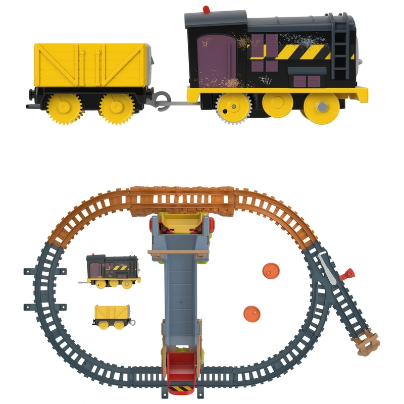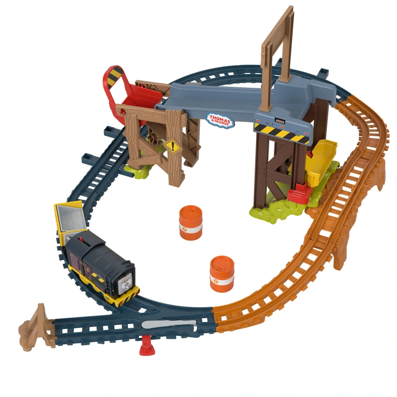 Flip the switch on Diesel to send him racing along 5 feet of track, picking up and delivering barrels to the busy construction site. Watch as barrels unload into the cargo elevator, roll down the chute, and reload for another trip.