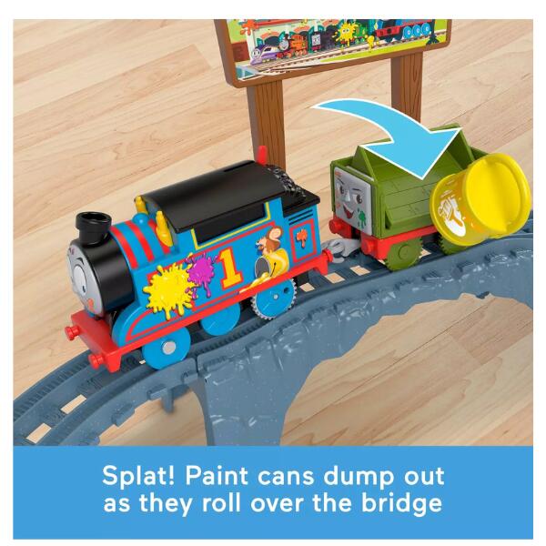 • Splat! As the train races over the bridge, the paint cans dump out of the Troublesome Truck!