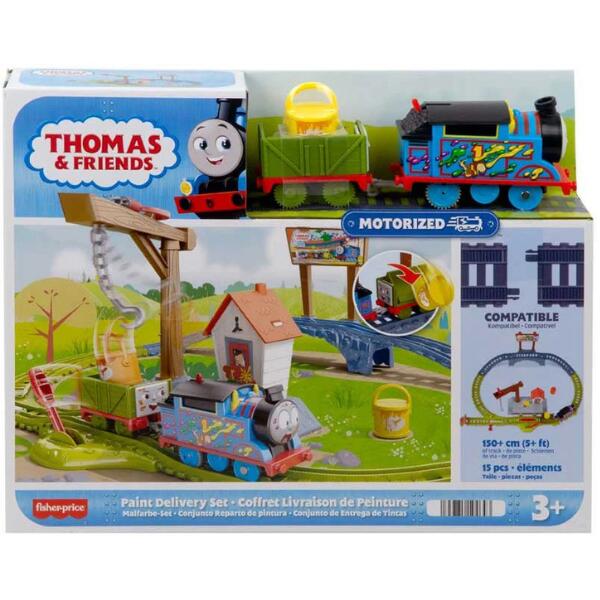 Preschool kids can send their good pal Thomas racing through Wayland Station to pick up and deliver paint with this Thomas & Friends motorised train and track set from Fisher-Price! Flip the switch on top of the engine to send Thomas racing along the track. But watch out! As Thomas pulls the Troublesome Truck over the bridge, the paint cans will wobble and dump out of the truck bed.