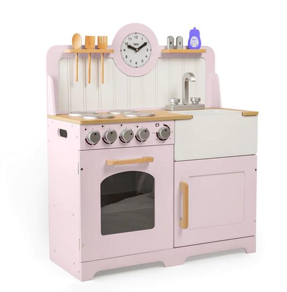 The Tidlo Country Play Kitchen is a beautifully crafted wooden play kitchen. Designed for children. Featuring a classic style in a soft pink colour that is built to withstand years of imaginative play. This kitchen includes an oven and hob with clicking dials, a storage cupboard, a Belfast sink, utensil shelves, and a clock with movable hands to help young chefs serve dinner on time!