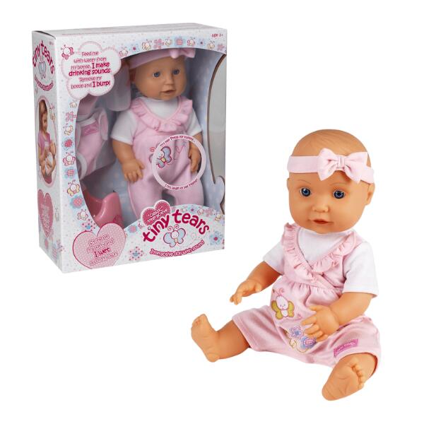 This fully functional Tiny Tears Classic Interactive Doll not only feeds, cries tears and wets but makes sound too, press her tummy to hear her laugh, cry or say ‘Mama’, feed her with water from the feeding bottle and she will make drinking sounds… take the bottle away and she will burp, press the button on her back, she will make crying sounds and produce real tears, then sit her on the potty and she will wet, This 38cm doll comes dressed in a 1 piece suit, fabric headband, bottle, bib, potty and nappy. Note: Manufacturer recommends consumers trying changing the batteries when item is received.