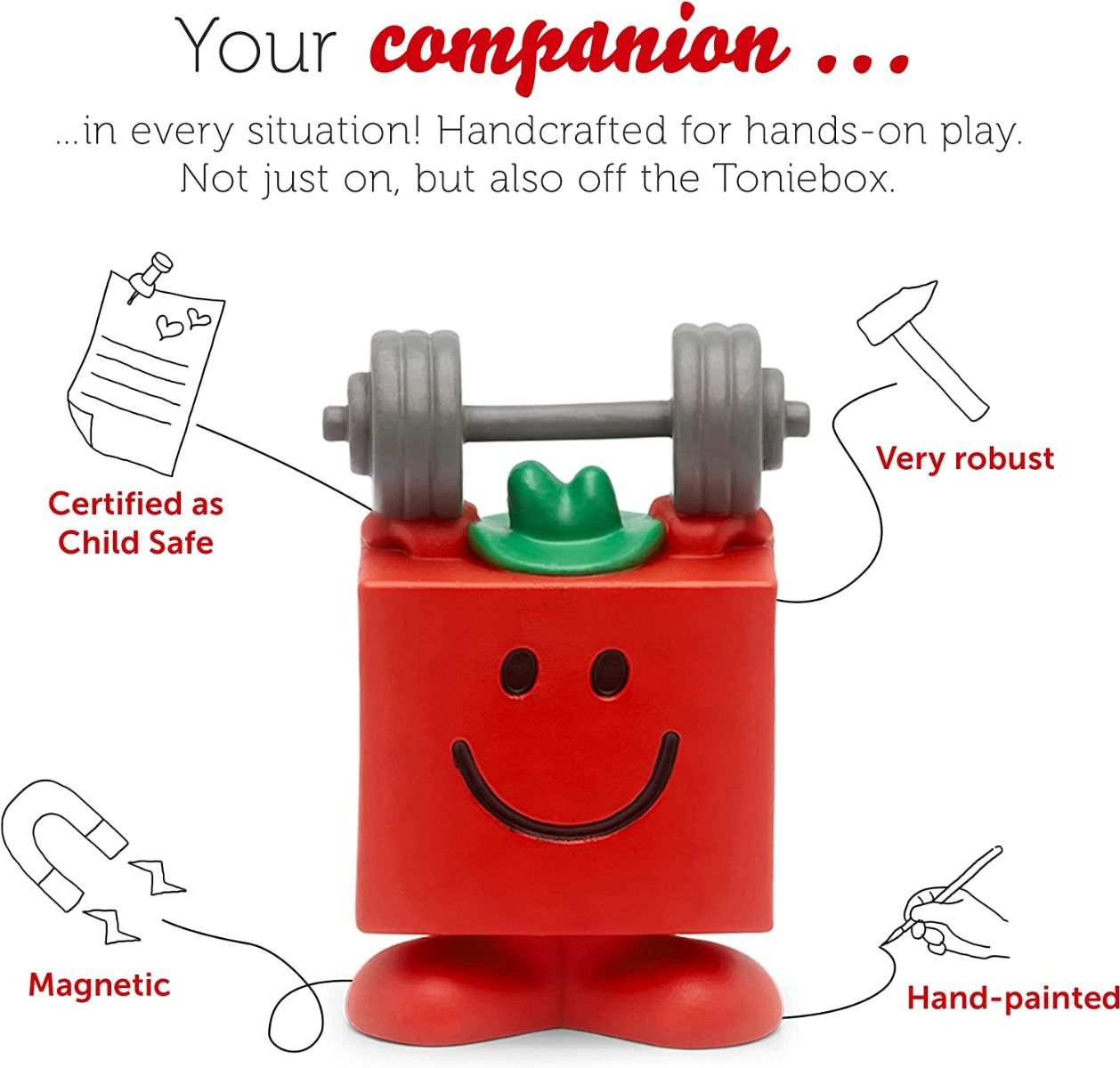Tonies – Mr Men + Little Miss – Mr Strong. Beautiful hand-painted figures that play audiobooks, songs and stories when placed on a Toniebox. Take music and bedtime stories wherever you go with fun characters, simple controls and no bright screens.