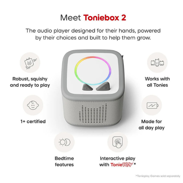 • Meet Toniebox 2! The audio player designed for children’s hands, powered by their choices and also built to help them grow with screen-free stories, songs, games and more!