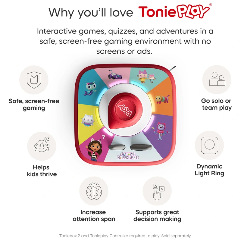 Unlock new ways to play, exclusively on Toniebox 2. The Tonieplay Controller activates the Toniebox 2’s built-in light ring, unlocking any Tonieplay game disc with selectable in-game options. With screen-free interactive audio games, kids can tap and play in an all new way.