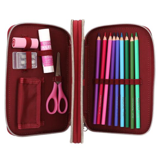 Adorable as can be: the front of this TOPModel pencil case, in a warm, deep red, features a super cute dog and cat design. Even better: an appliquéd scarf can be tied in front of the two furry friends. It also has harmonious metallic details with a coppery look. The pencil case’s two separate compartments are filled with 18 colored pencils, 2 regular pencils, an eraser, a pencil sharpener, a ruler, scissors, a glue stick, and also a small Velcro pouch.