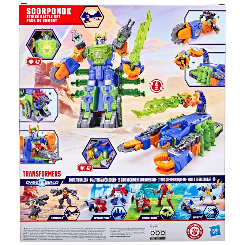 Explore action-packed adventures with the Transformers Cyberworld Scorponok Strike Battle Set, a 2-in-1 convertible figure that transforms from a 35cm robot. To a giant 50.5cm battle-ready scorpion playset in just 4 simple steps! With detachable accessories compatible with each mode, and fold-out battle stations for additional Cyberworld figures (sold separately). The Scorponok is built for interactive play!