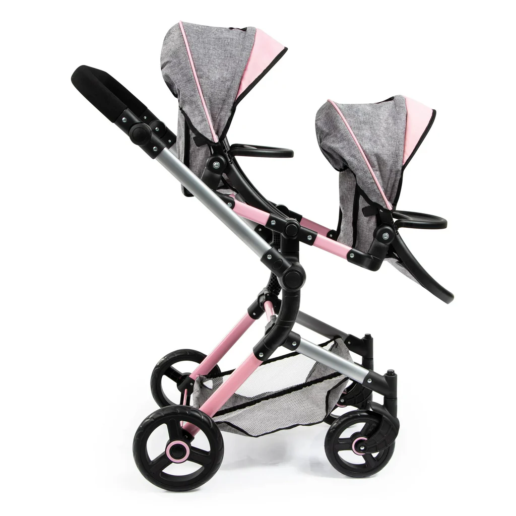 This modern twin doll’s pram is suitable for dolls up to 18″.. The twin tandem has flexible sun covers and a height-adjustable handle, therefore it is easily adaptable to the child’s height. It’s possible to insert each seat in direction of travel or towards the child. Moreover the seats can be positioned straight – seat behind seat – or with an angle – one seat is more down, the other one more up. The twin doll’s pram can be folded up to save space when travelling. Thanks to the integrated shopping basket, everything that is needed for a beautiful day trip, can be stored. It is also possible to mountain the EasyGo doll’s car seat (not included in the delivery) on the twin tandem.
