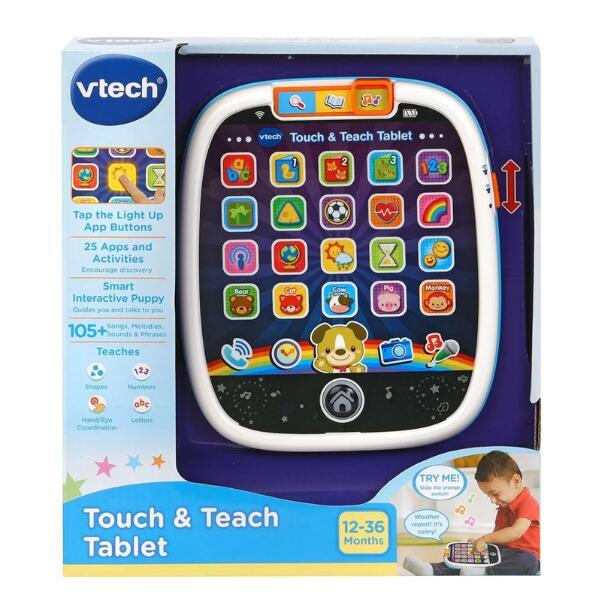 VTech Touch & Teach Tablet. Press the 25 pretend light up app buttons to explore, discover and learn numbers, shapes, animals, colours, letters and more. Take virtual pictures, make pretend phone calls and check the time! Features 3 modes of play, light up glowing home button and includes 3 sing along songs and 20 melodies. Your little one will have a tablet of their very own with the Touch & Teach Tablet by VTech!. Tap the 25 pretend light up apps buttons to explore, discover and learn early skills including numbers, shapes, animals, colours, letters and much more. Take virtual pictures, make pretend phone calls and check the time!. Features 3 modes of play; Explore, Music and Learn. Light up glowing home button and swiping along the buttons triggers fun light patterns. Includes 3 sing along songs and 20 melodies.