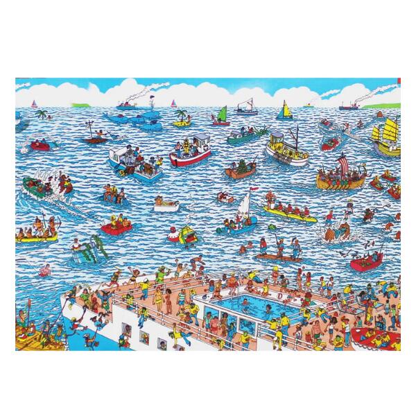 A fantastic 250-piece Where’s Wally junior jigsaw puzzle that offers children hours of amusing adventures with the renowned red and white jumper-wearing character! In this jigsaw Wally is bobbing about at sea. The puzzle shows a busy waterway full of a variety of floating vessels with plenty of amusing scenes and antics to discover but where’s Wally Can you spot him out at Sea Created by Martin Handford and first published in 1987, Where’s Wally is one of the most recognisable characters in the world and a pop-culture icon. Distinctively dressed in his red and white striped sweater, black-framed glasses and a bobble hat, Wally is a world traveller, always in search of the next adventure.