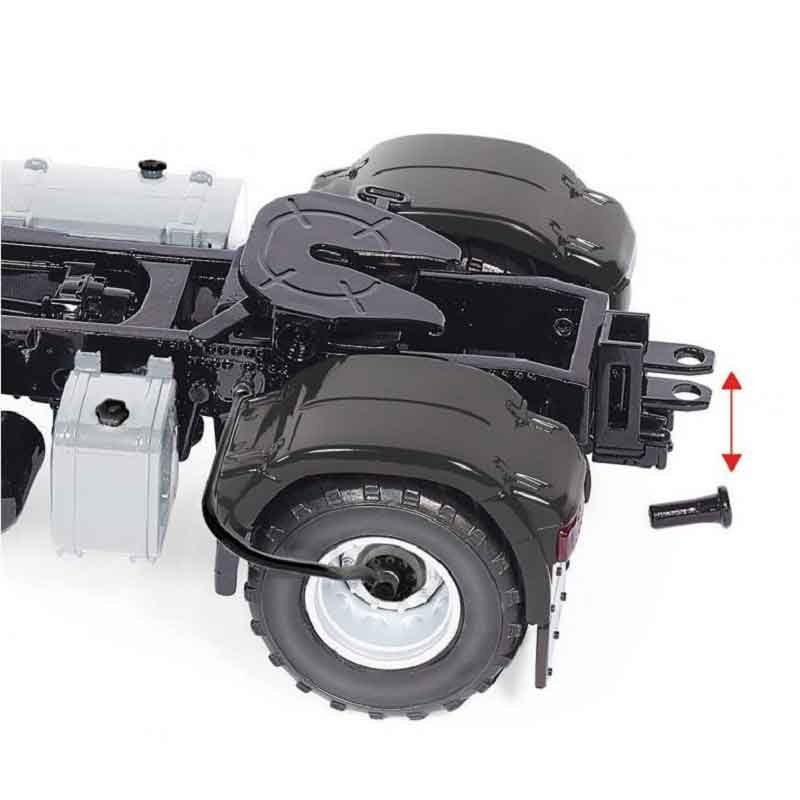 The doors can be opened, and the view into the interior of the cabin contains the absolute fascination of detail that is typical of WIKING. In addition, the radiator grille can be swiveled upwards, so that a view of the installed units is available. The front axle has a steering function, the tilting driver’s cab provides an overview of the precisely reproduced engine underneath. In addition, the tow bar at the rear of the tractor allows for easy combination with the trailers already available in the WIKING agricultural range.