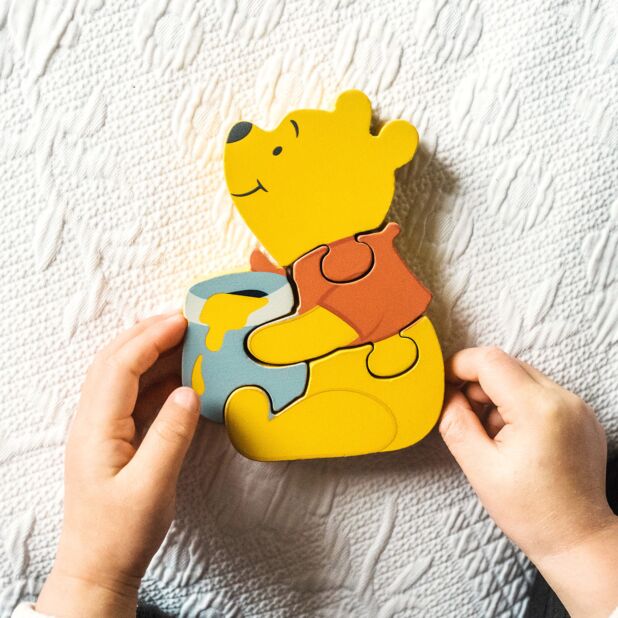Painted with vibrant colours. This puzzle set is made up of 4 chunky wooden pieces which form the lovable character Winnie The Pooh holding a honey pot. Your toddler will love the challenge of putting together this delightful picture. Designed in the UK, it would also make the perfect toy for your little one and comes in a canvas bag for storing away in your cupboard. An ideal gift for a birthday or Christmas for any lover of Disney’s Winnie The Pooh stories. Suitable for children aged 1 year or over.