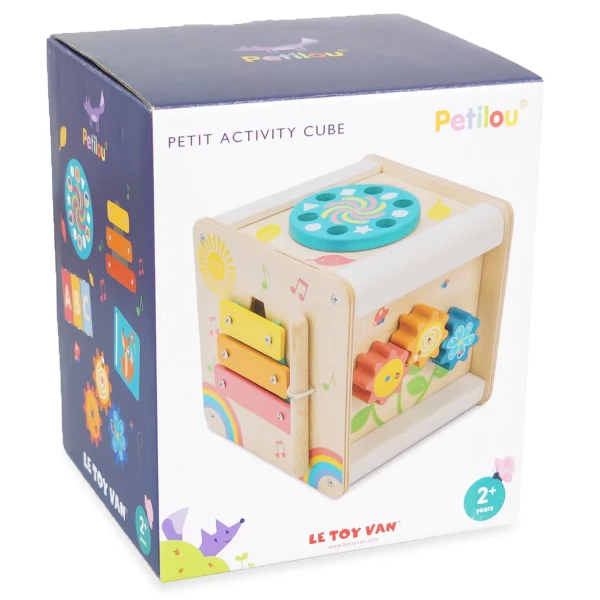 Introducing the Wooden Activity Cube. A multi-functional activity cube for toddlers, with a beautiful wooden structure and compact design. This complete little activity centre includes: door to open, spinning wheel, ABC/123 flaps, a xylophone, three gears in a flower motif to spin around and two birds sliding across an autumn tree.