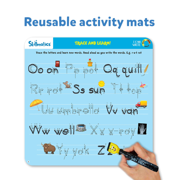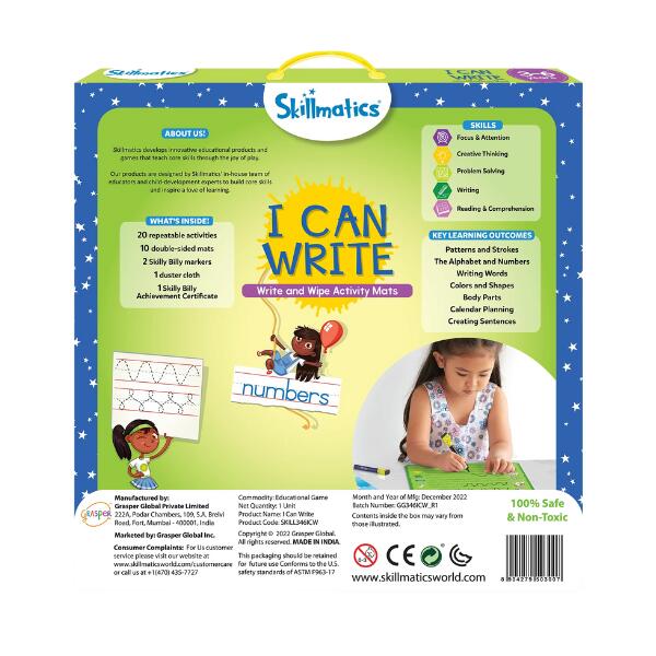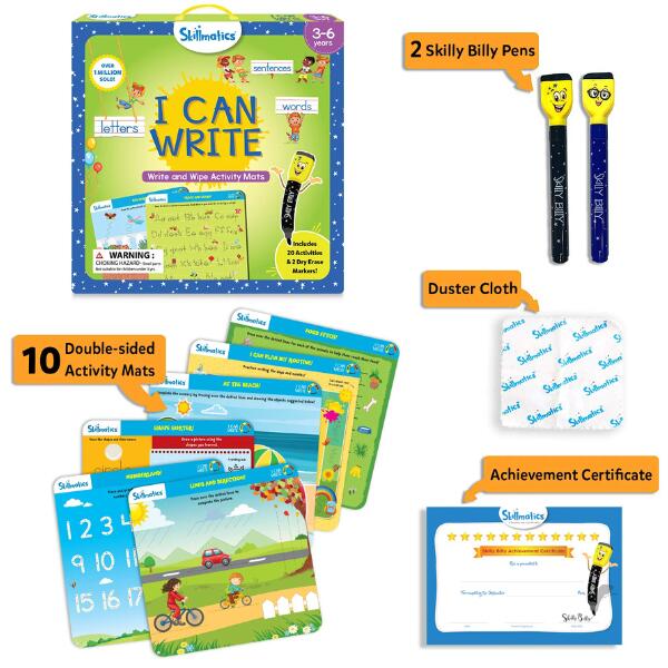 Write & Wipe I Can Write Activity Book. I Can Write has 20 repeatable activities that help children learn through repetition. This unique activity set was designed to enhance reading, writing and problem-solving skills. It includes 10 double-sided activity mats, 2 “Skilly Billy” dry-erase pens, 1 duster cloth and 1 achievement certificate.