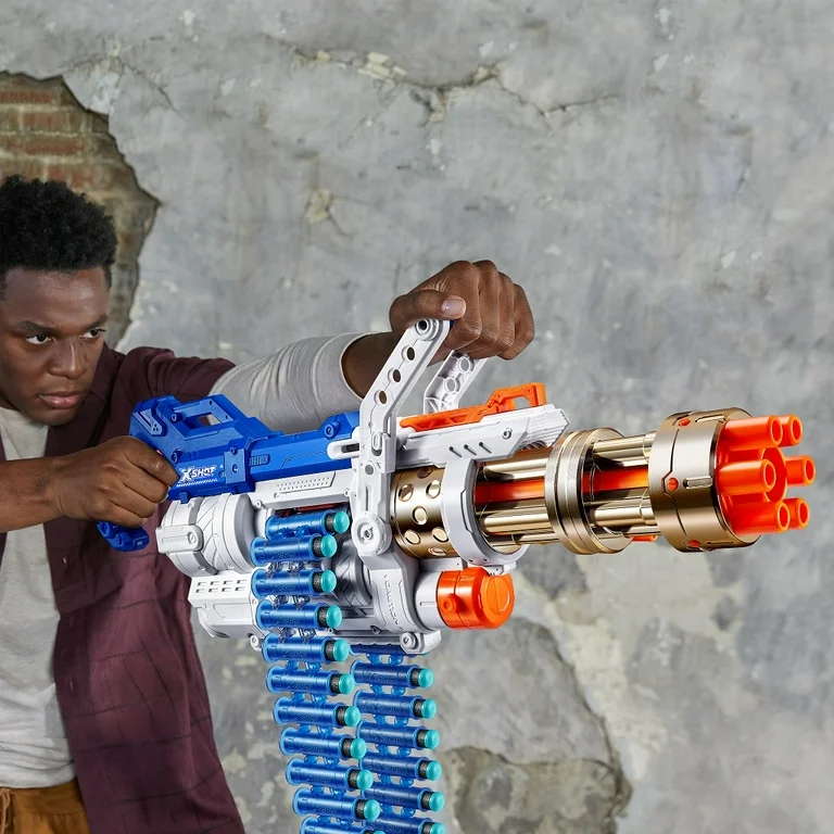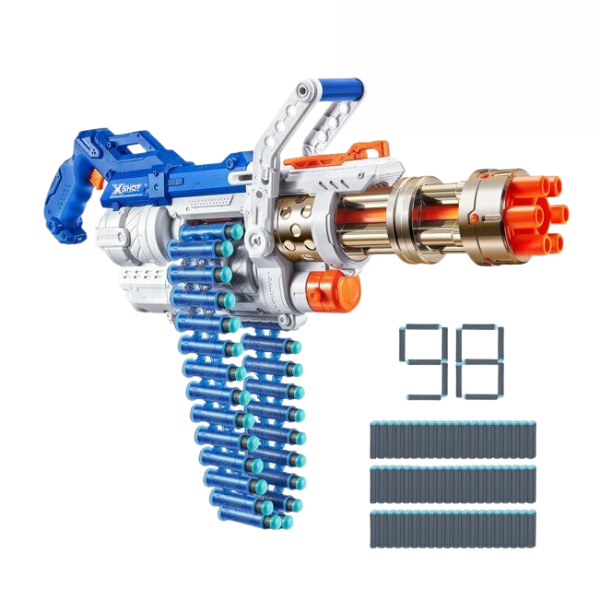 The X-Shot Excel Golden Omega Royale Blaster is the ultimate blaster you have been waiting for. You can annihilate your opponents with the single shot function from up to 90ft/27m away. When the heat of battle intensifies, unleash your 30-dart belt with Slam-Fire and take out the enemy with an inferno of flying darts. You can blast up to 4-darts per second during Slam-Fire mode & see your auto-rotating barrel release our award-winning X- Shot darts. Once you empty your dart belt, simply refill and get back into the action. This blaster will make an ideal present for your child and is sure to provide lots of fun and also entertainment. They can play by themselves by making their own target to aim at or maybe they can play with their friends.