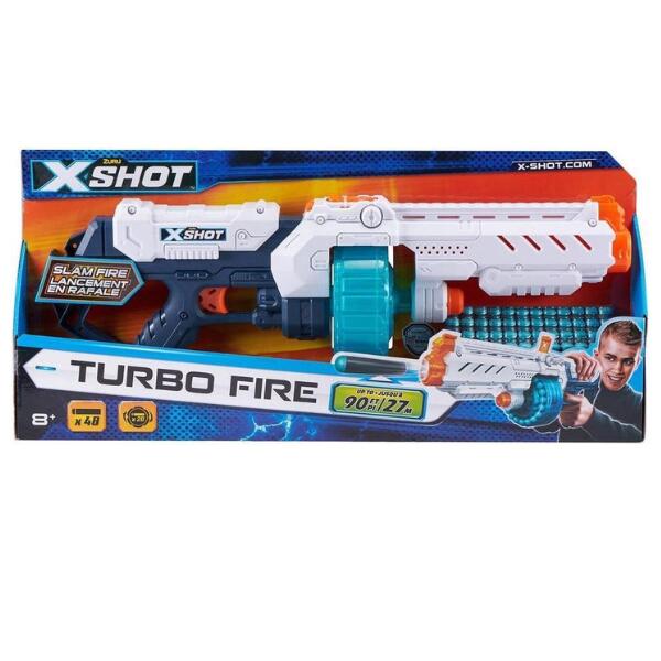 Introducing the Zuru X-Shot Excel Turbo Fire Blaster (48 Darts). The X-Shot Excel Turbo Blaster Turbo Fire is what all blaster fans have been waiting for. It combines High accuracy blasting and also the ultimate Slam Fire mechanism in one single blaster. Use the single-shot function with the sleek pop-up sight to sharp shoot any opponent from up to 90ft/27m away. When the heat of battle intensifies, unleash your rotating 20-dartbarrel with Slam Fire and take out the enemy with a storm of flying darts. This blaster gives you the chance to sharp-shoot opponents.
